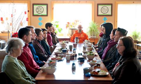 In silence, people piled their plates with food, added a squirt or two of condiments (eating mindfully doesn’t mean forsaking the hot sauce) and sat down together with eyes closed during a Buddhist prayer for gratitude and moderation.